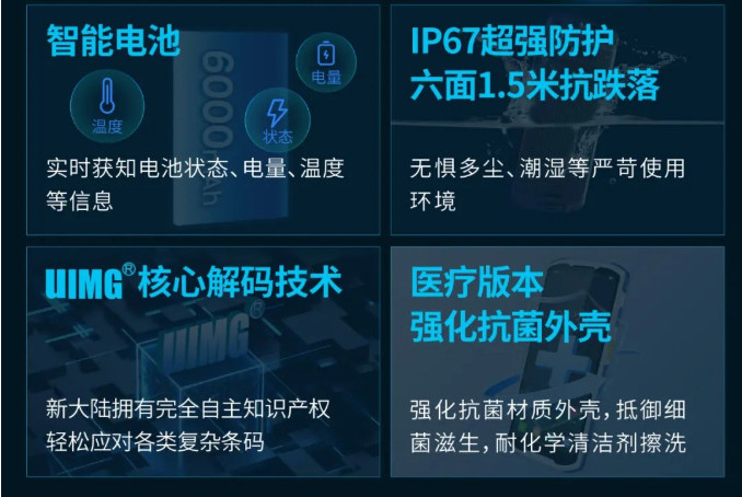 護航持續(xù)作業(yè) 智能電池 IP67超強防護 六面1.5米抗跌落 實時獲知電池狀態(tài)、電量、溫度 無懼多塵、潮濕等嚴(yán)苛使用 等信息 環(huán)境 UIMG核心解碼技術(shù) 醫(yī)療版本 強化抗菌外殼 新大陸擁有完全自主知識產(chǎn)權(quán) 強化抗菌材質(zhì)外殼,抵御細(xì) 輕松應(yīng)對各類復(fù)雜條碼 菌滋生,耐化學(xué)清潔劑擦洗 手套模式 OCR 支持 雙麥降噪 人臉解鎖 智能識別 Wi-Fi漫游 豐富外設(shè) 匹配更多應(yīng)用場景 手柄 配套手柄使用,優(yōu)化抓握使用方式,有效降低使用疲勞,提升工作效率。