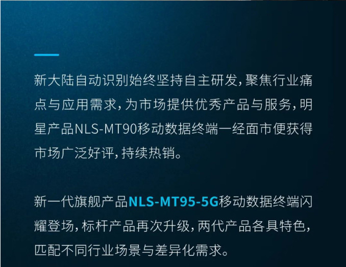 RFID OCR識讀 NFC 1300萬/800萬RFID 遠(yuǎn)距掃碼 一/二維碼 像素攝像頭 您架 17 新大陸自動識別始終堅持自主研發(fā),聚焦行業(yè)痛點與應(yīng)用需求,為市場提供優(yōu)秀產(chǎn)品與服務(wù),明星產(chǎn)品NLS-MT90移動數(shù)據(jù)終端一經(jīng)面市便獲得市場廣泛好評,持續(xù)熱銷。