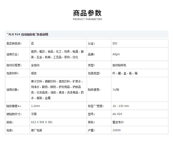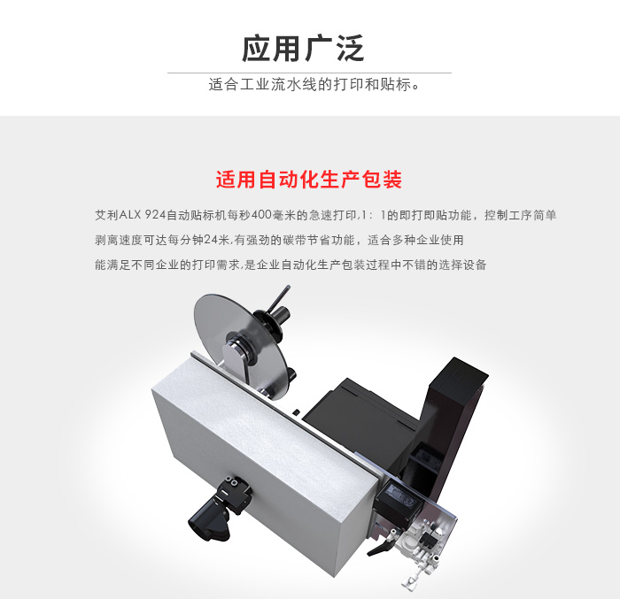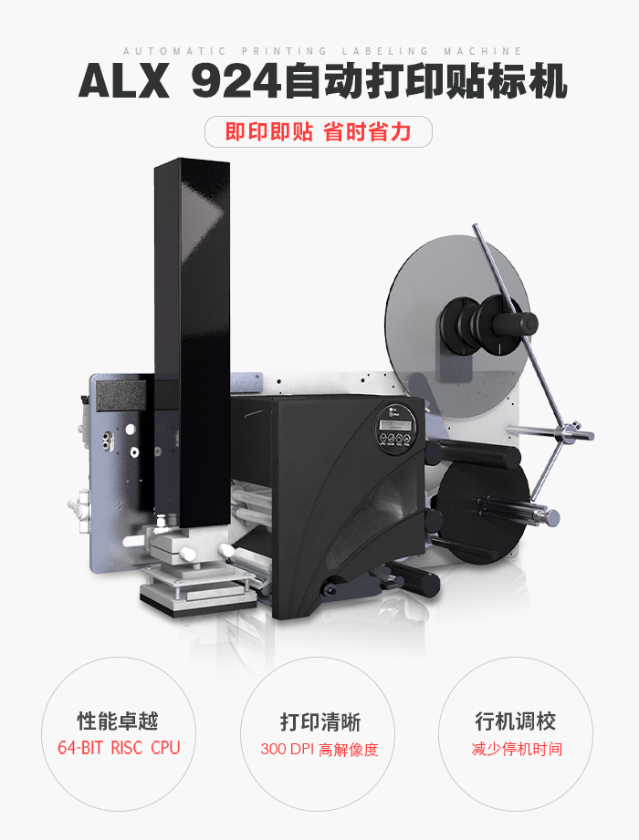 ALX 92x 打印貼標(biāo)機(jī)產(chǎn)品系列產(chǎn)品編號(hào)、條碼、生產(chǎn)日期及產(chǎn)品描述;由于市場(chǎng)對(duì)產(chǎn)品資料的要求不斷提高,因此更需要有一個(gè)快速、可靠的打印貼標(biāo)系統(tǒng)來(lái)應(yīng)付。高科技的打印技術(shù)ALX 92x 的表現(xiàn)在市場(chǎng)中無(wú)人能及!