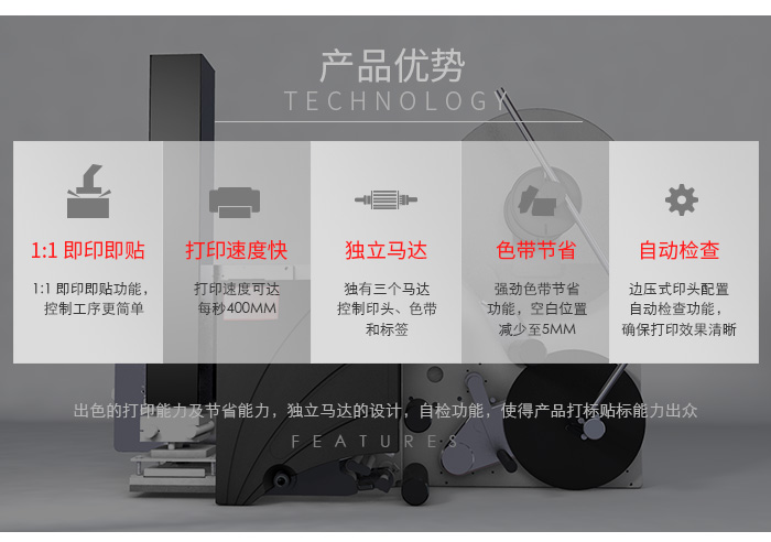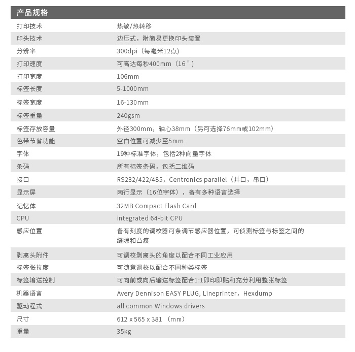 ALX 92x打印貼標(biāo)機(jī)自動(dòng)碳帶節(jié)省功能強(qiáng)勁碳帶節(jié)省功能,保證帶來(lái)高成本效益RFID 。ALX 打印貼標(biāo)系統(tǒng)依靠其卓越的打印功能,是打印RFID 標(biāo)簽的最佳選擇64-bit CPU 可在打印速度高達(dá)每秒400mm的情況下,打印出300 dpi 高解像度、清晰印刷品,締造出無(wú)懈可撃的打印威力。不只功能卓越,而且亦相當(dāng)可靠及經(jīng)濟(jì)實(shí)用利用以太網(wǎng)(Ethernet)可輕易連接到你現(xiàn)有之資料處理系統(tǒng)為保護(hù)芯片及印頭,你可先于打印機(jī)設(shè)定晶片位置。獨(dú)特的邊壓式打印頭設(shè)計(jì),于預(yù)設(shè)的芯片位置或標(biāo)簽空白的位置會(huì)自動(dòng)提升(如標(biāo)簽版面已設(shè)定于無(wú)線收發(fā)器附近)