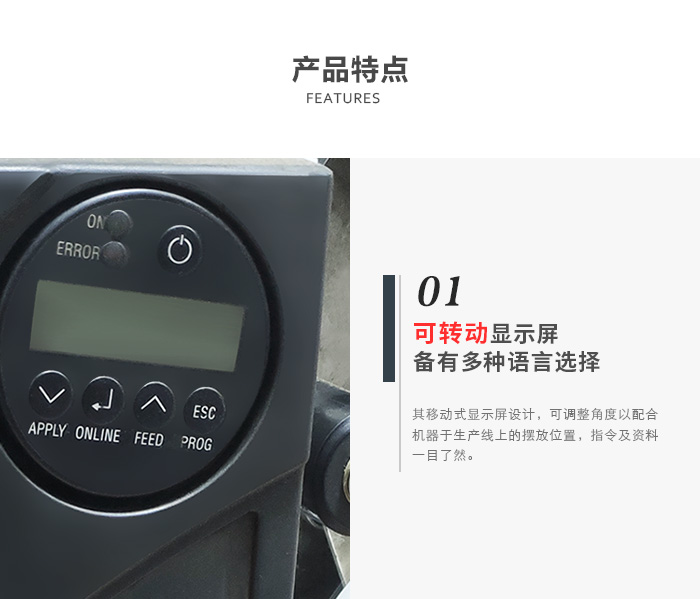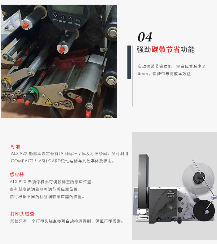 ALX 92x打印貼標(biāo)機(jī)可以在行機(jī)時(shí)同時(shí)進(jìn)行調(diào)較,可以減少壞機(jī)停產(chǎn)時(shí)間特點(diǎn)顯示屏備有多種語(yǔ)言選擇,可適用于世界不同地區(qū)。而其移動(dòng)式顯示屏設(shè)計(jì),可調(diào)較角度以配合機(jī)器于生產(chǎn)線上的擺放位置,指令及資料一目了然。打印頭簡(jiǎn)易更換打印頭設(shè)計(jì),無(wú)須工具,節(jié)省時(shí)間。而打印頭于出廠時(shí)經(jīng)精密調(diào)較,保證優(yōu)良的打印質(zhì)素標(biāo)準(zhǔn)ALX 92x 的基本設(shè)定備有19 種標(biāo)準(zhǔn)字體及標(biāo)準(zhǔn)條碼。另可利用Compact Flash Card記憶儲(chǔ)存其他字體及標(biāo)志感應(yīng)器ALX 92x 無(wú)須停機(jī)亦可調(diào)較標(biāo)簽的感應(yīng)位置。備有刻度的調(diào)較器可調(diào)節(jié)感應(yīng)器位置,你可根據(jù)不同的標(biāo)簽調(diào)較感應(yīng)器的位置打印頭檢查打即使只有一個(gè)打印頭燒點(diǎn)亦可自動(dòng)檢測(cè)得到,保證打印質(zhì)素。